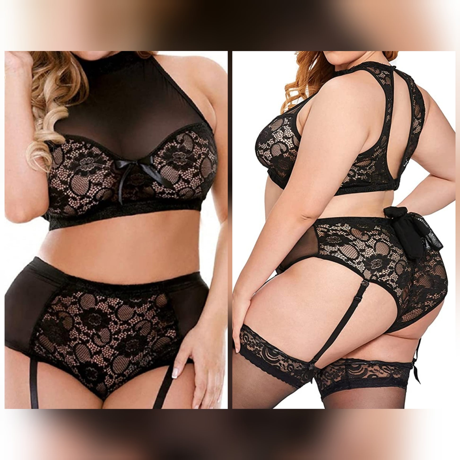 Lacey, sexy 2 piece halter top with button back and waist high bottoms. Attached to garters and comes with matching wrist band that fits through cutout keyhole in back of underwear for added kink. Perfect for a boudoir photo shoot or romantic night in, top can also be worn as shirt for a night out on town.