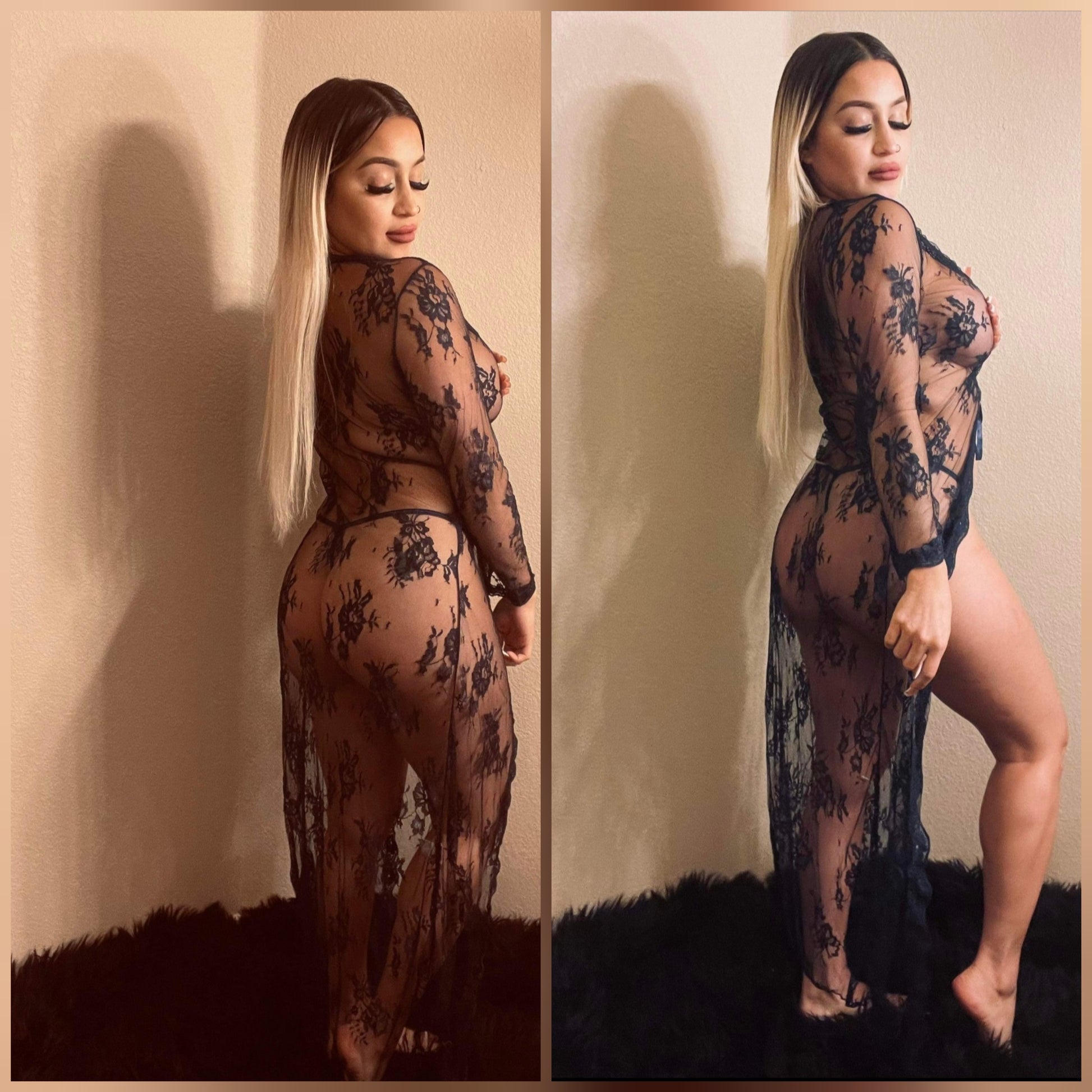 This sexy sheer robe will have you feeling yourself all night long and have your partner unable to keep their hands off you. Perfect for a sexy night in or a boudoir photo shoot. Comes with matching g string. Available in size LG