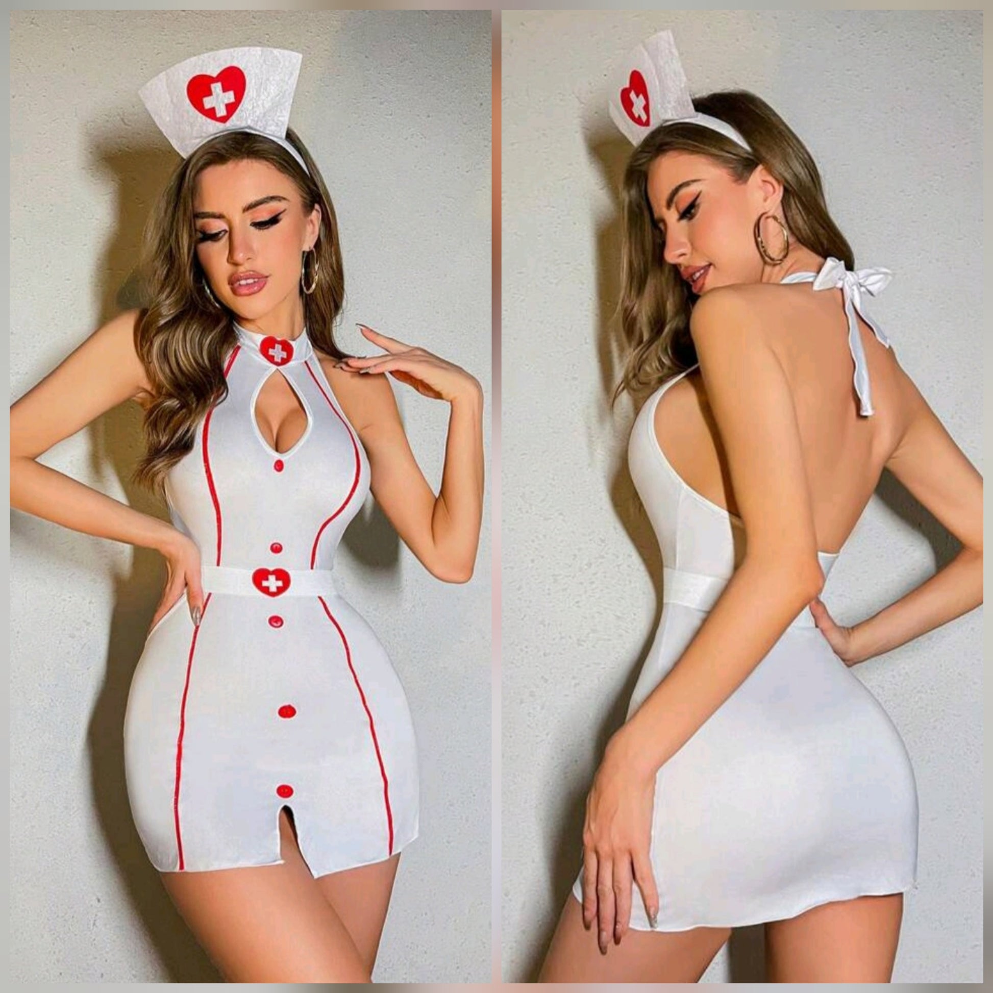 Get ready to nurse any patient back to health in this Sultry nurse form fitting dress. Ties at neck for easy adjusting, features a keyhole peekaboo chest, slit in middle. Matching hat included. Size LG (8-10)