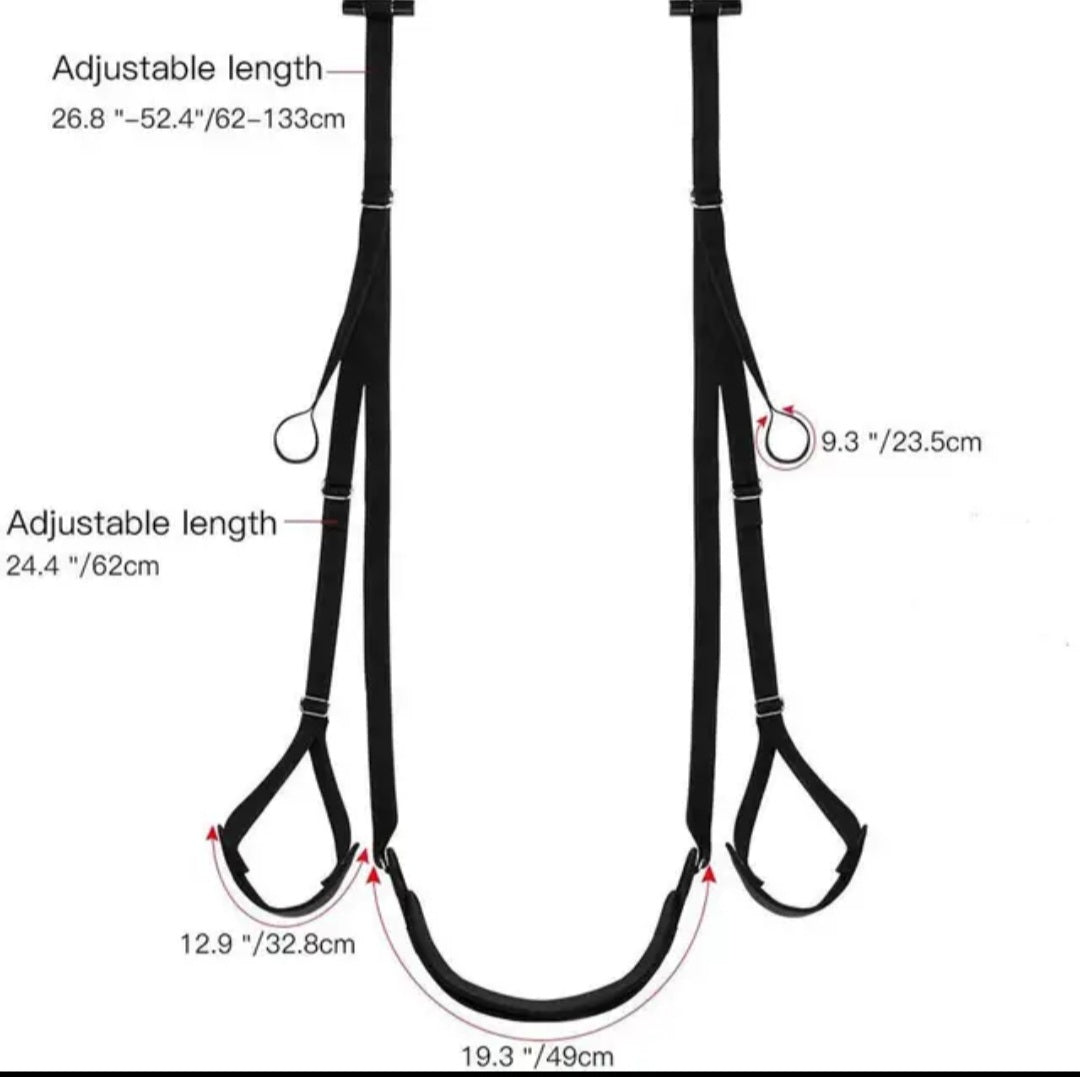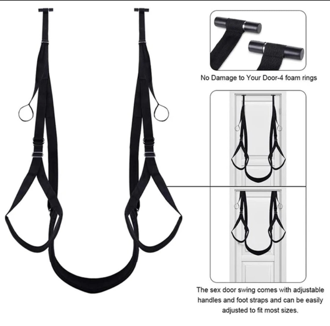 Spice up a romantic night in with this over the door sex swing. Completely safe and durable holds up to 300 lbs. Simply place restraints over the door and close it then strap yourself in. Comes with adjustable handles and foot straps for most sizes. For extra added fun use a blindfold and tickler.