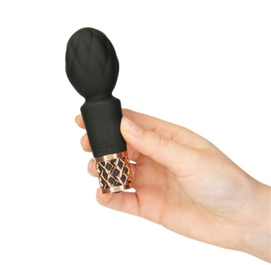 Key features of the Mini Vibrating Wand Massager: Flexible Massage Head. Quilted Pattern. Incremental Speed Control. Press and Hold Technology. Light Up Base. Gold Lattice Detail. Travel Lock. Waterproof. Discreet Size and Sound. High Grade Body Safe Silicone Finish. Powered by Power Bullet. Magnetic USB Rechargeable. Charge time 2 hours. Up to 1.5 hours of play time. Box contents Pleasure Mini Massager Wand. USB Charge Cord. Satin Storage Pouch. Cleaning Brush. Quick Start Guide. Dimensions: length 4.4 inches. Width 1.4 inches.