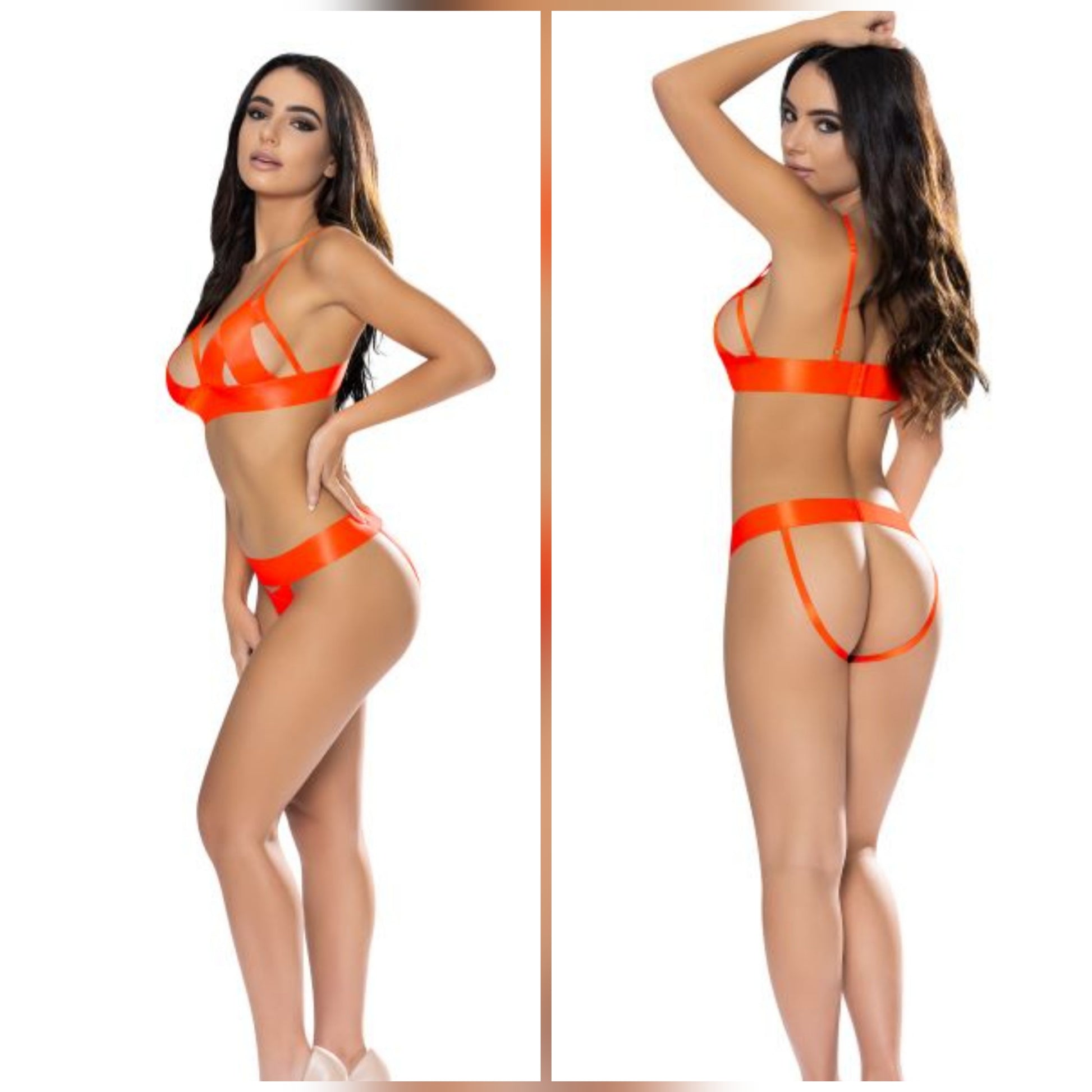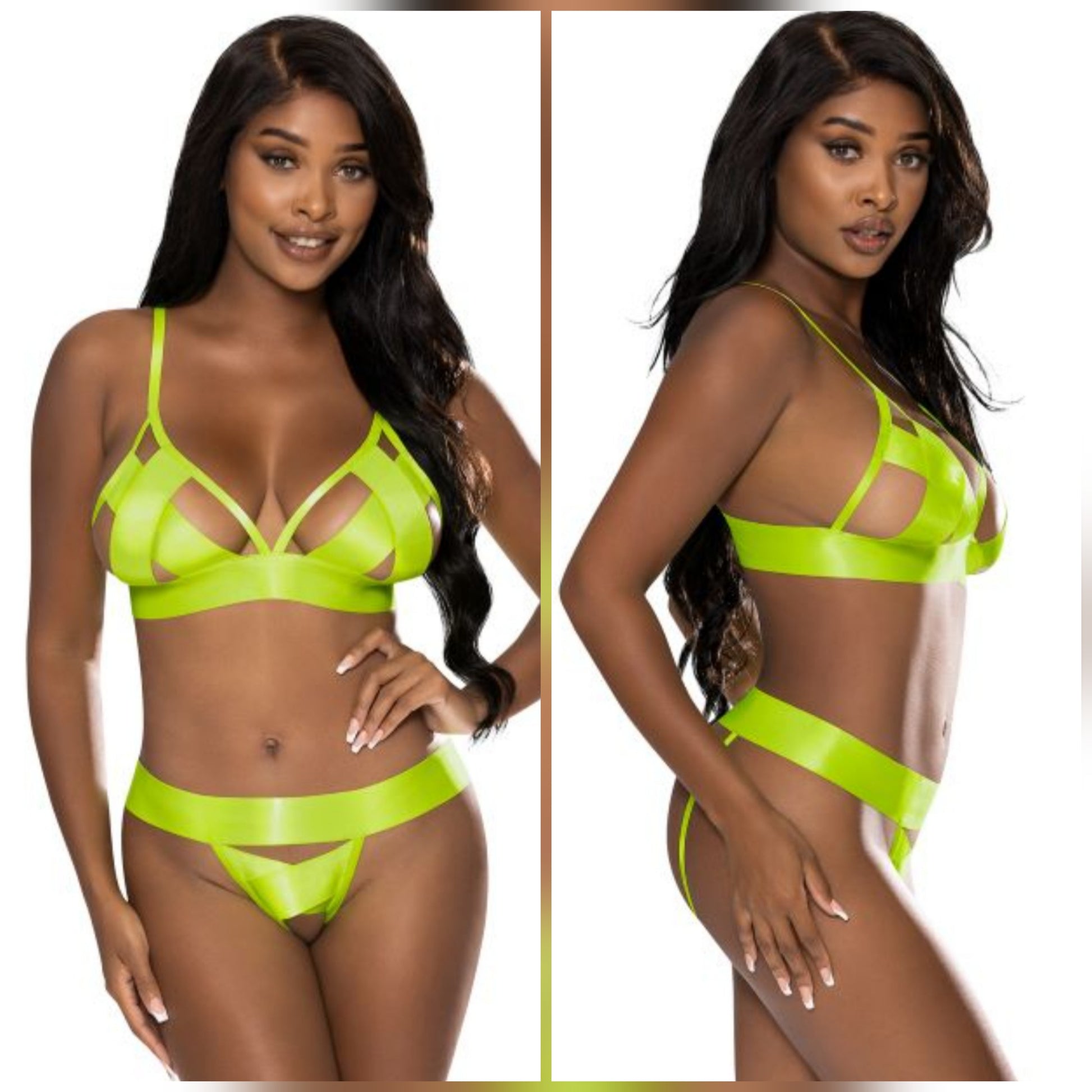 Do you dare to press play ? This style includes: a bra featuring thick bondage style strappy bra cups, adjustable shoulder straps with metal sliders, O-ring details, a hook and eye closure at the back, and a matching crotchless panty. Plush satin elastic straps with a slight sheen in electrifying colors neon yellow or risqué red. Available in sizes sm-2XL