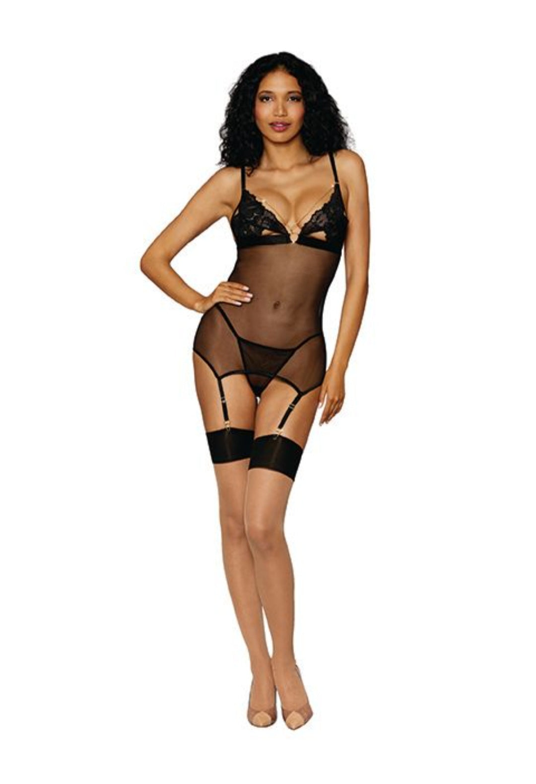 Pure seduction comes with pure confidence and you're going to want to leave the lights on for this style. Lace and Mesh Garter Slip Set featuring: Lace cups with peek-a-boo details. Gold hardware and removable chains. Adjustable garters and shoulder straps. Ties in the back. Thigh highs not included. Available in o/s. One size fits most sizes 2-12.