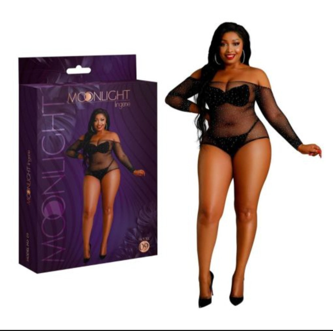 Get your fill of fantasy with this translucent lingerie with sparkling diamonds all over the corset, you will look mesmerizing! Bodystocking features: long sleeves, low neckline and off the shoulder neck. This bodysuit beautifully highlights your hips, buttocks and bust area. Do you like shiny and fancy lingerie? Then this is for you! Available in one size queen sizes 10-22