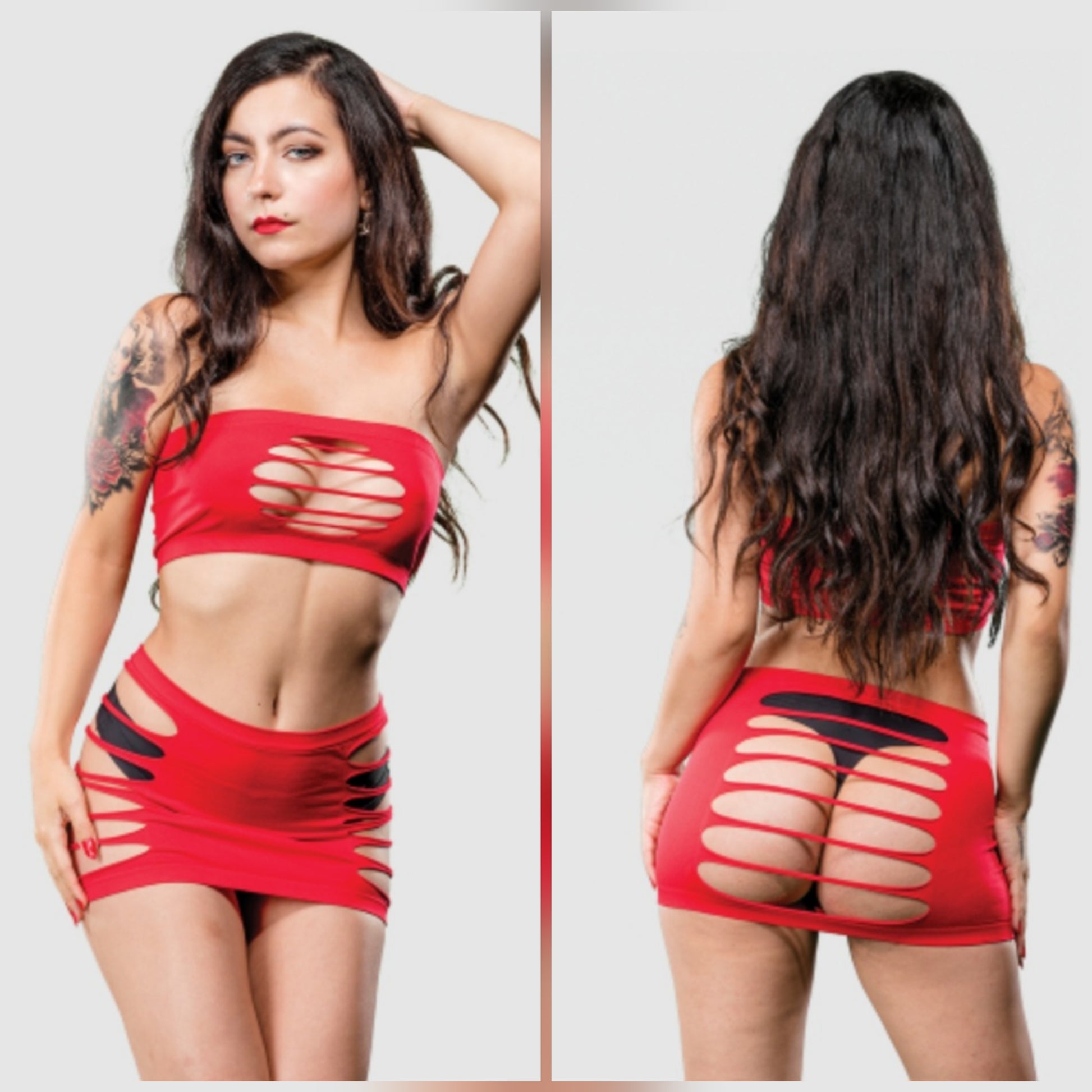 This is a 2 pieces set, bustier and skirt. Made of stretchy Nylon and Spandex and very durable. You can wear it 3 different ways depending on your mood. It will show all your sexy curves and will for sure arouse your partner. One size fits most 2-10 available in black or red